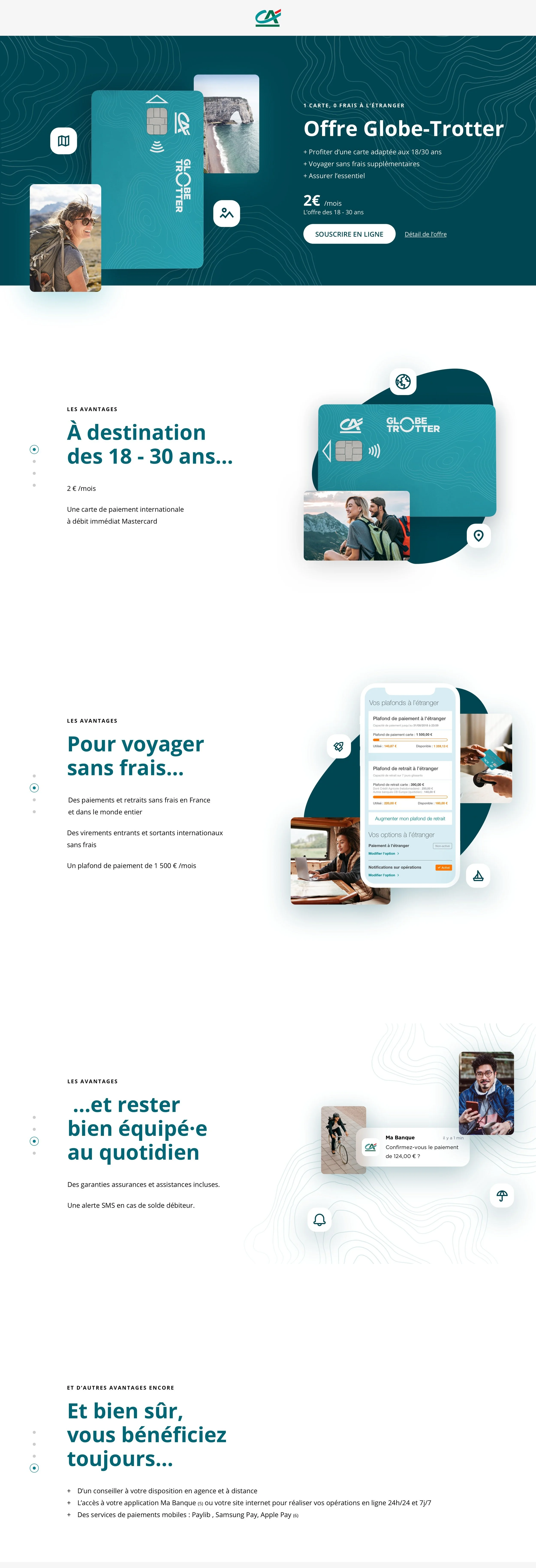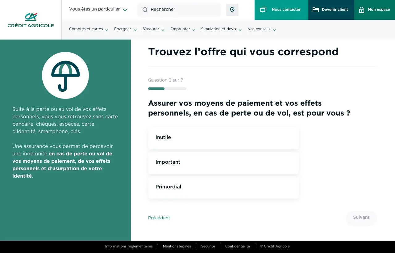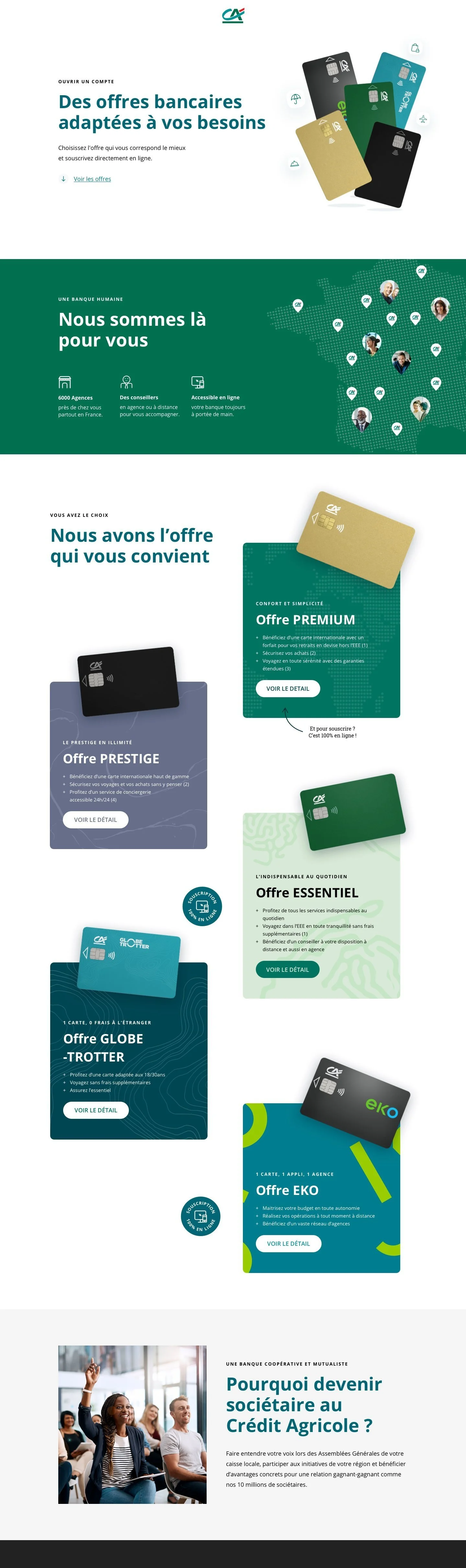 ✺ Création d’un template de landing page déclinable pour l’ensemble des offres du Crédit Agricole, permettant de mettre en avant de façon visuelle les diverses catégories de services proposés.