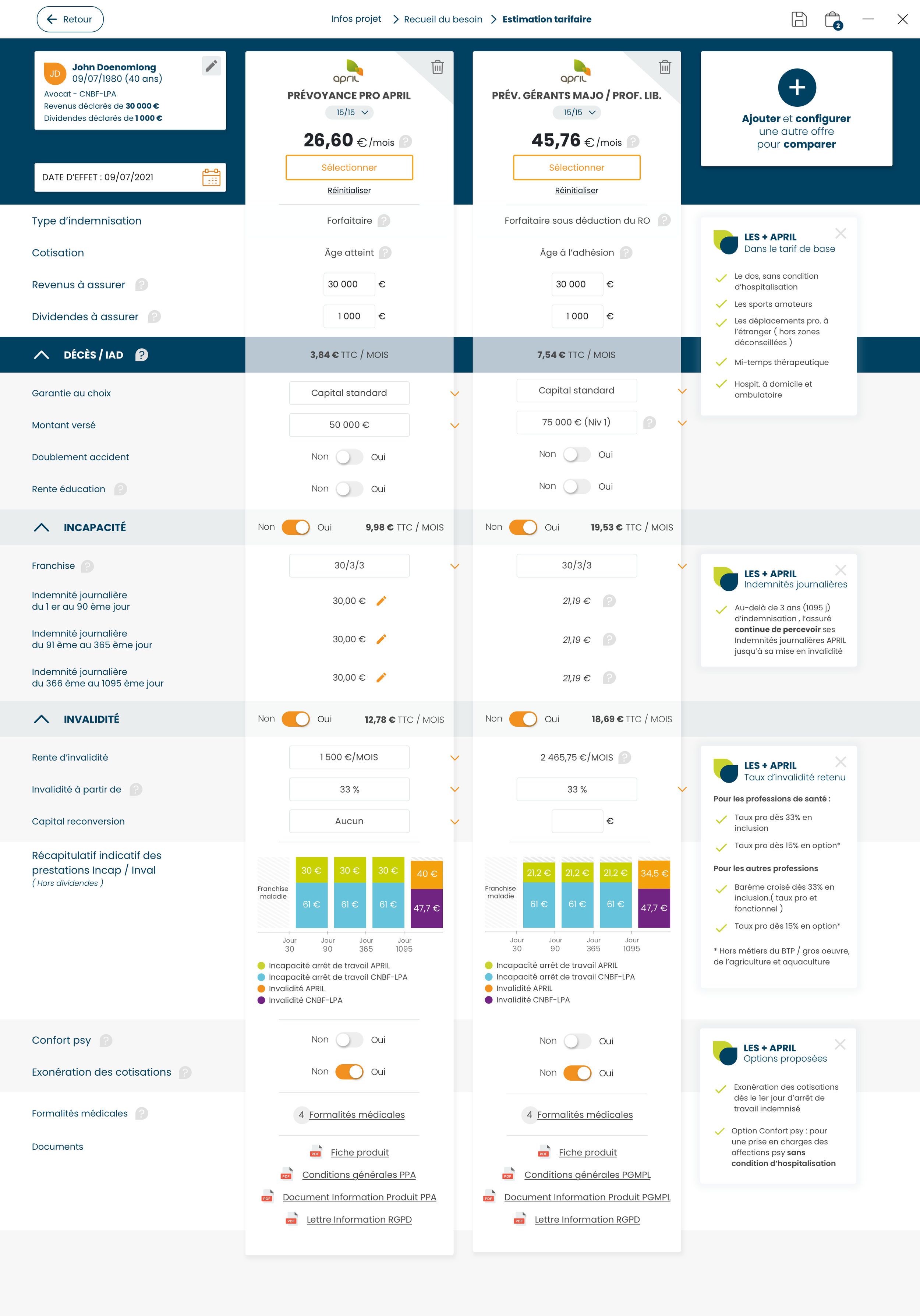 Plus complet qu’un comparateur tarifaire, la Marketplace APRIL permet au courtier de proposer à son client une sélection de solutions classées selon leur niveau d’adéquation en fonction du tarif mais aussi de plusieurs autres critères, liés au besoin réel du client.